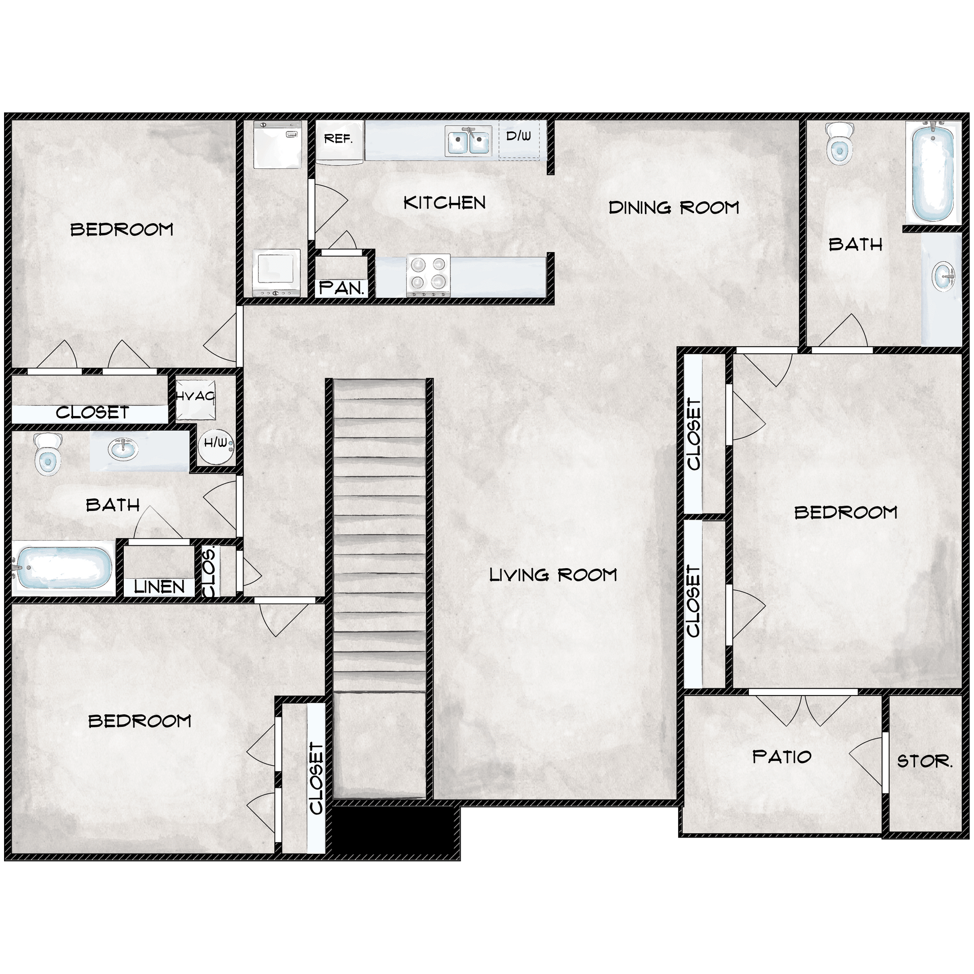 Our three-bedroom units are ideal for residents who require additional space for family, hobbies, or a work-from-home setup. Our apartments include outdoor patios, ceiling fans, and household appliances that support regular routines and provide long-term value.
